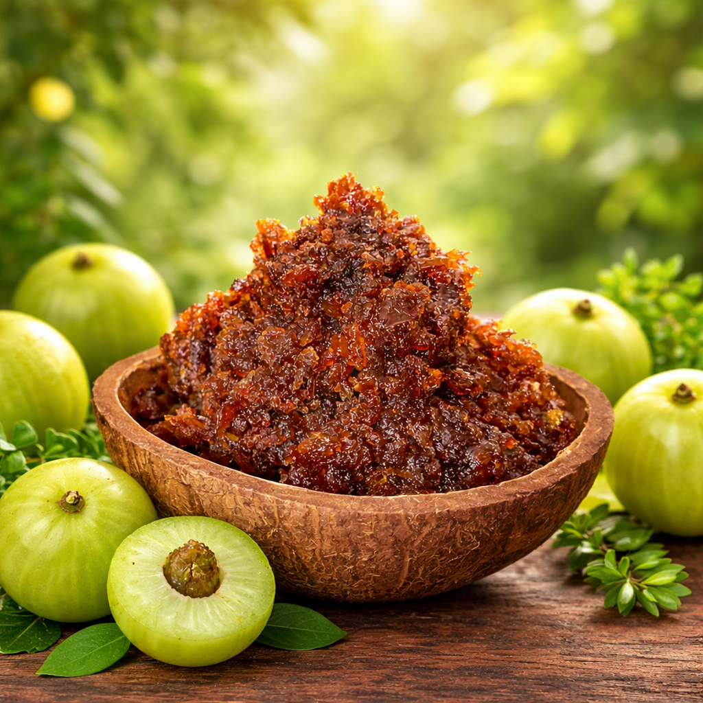 It is crafted with the essence of pure amla, preserved with care, naturally refined, untouched by additives and artificial preservatives. The intention is to balance the tradition and thoughtfully prepared nourishing dessert designed for everyday wellness.