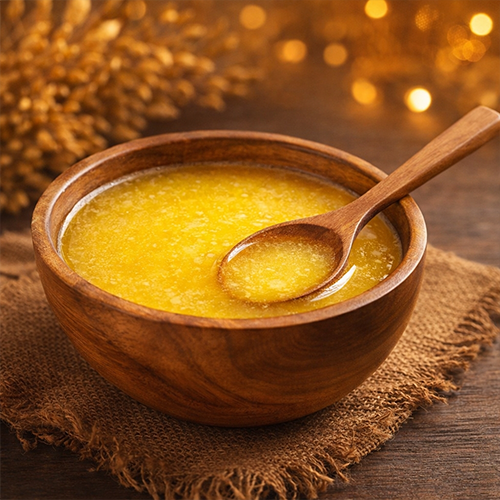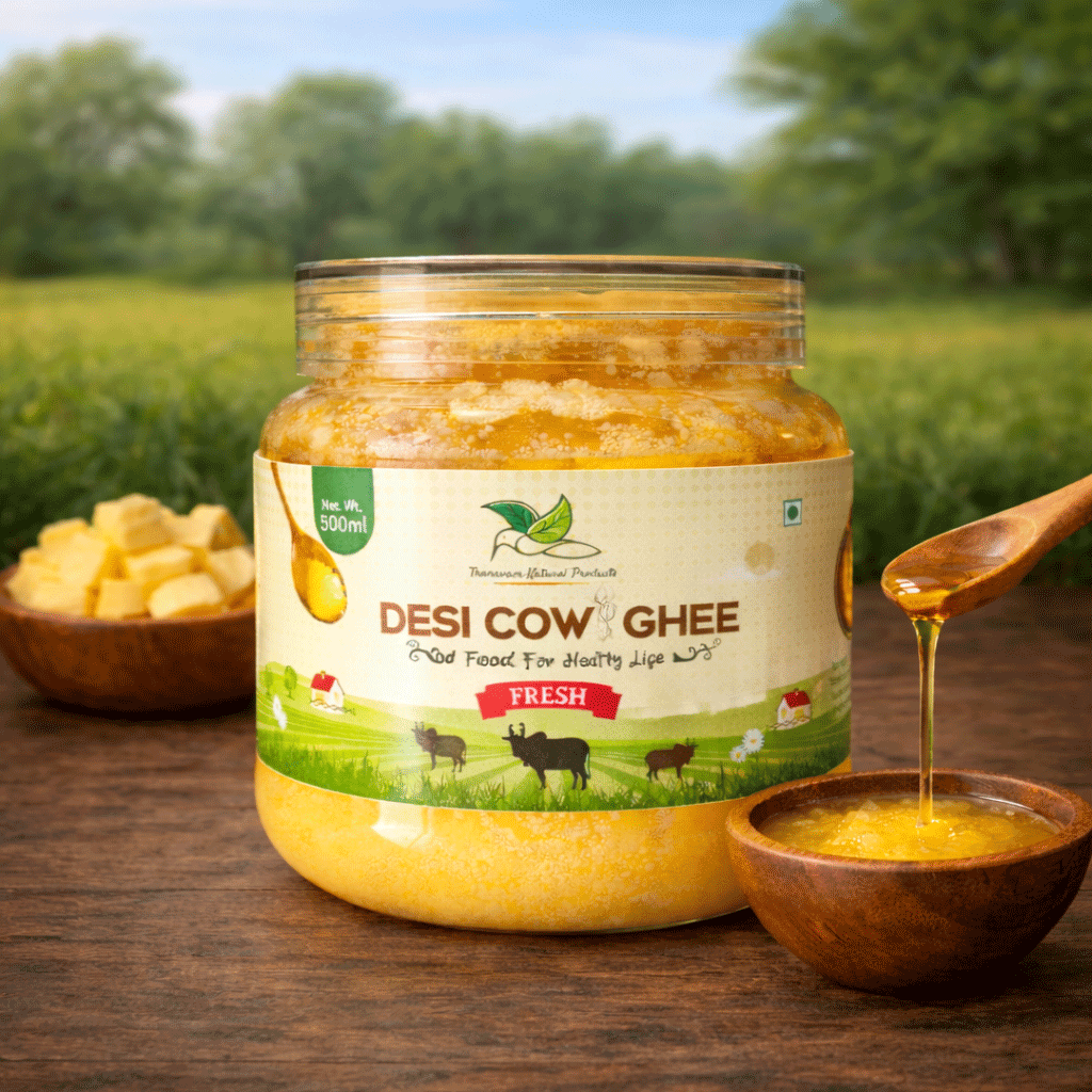Traditionally crafted Desi Cow Ghee from native cows with rich aroma, golden purity and natural nourishment in every spoon.